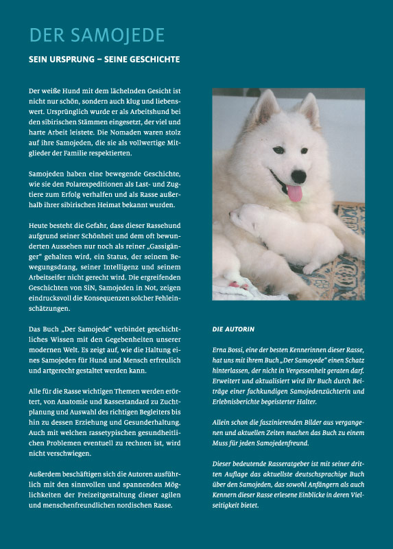 Mit Hilfe profunder Samojedenkenner und sportlich aktiven Menschen wurde das Buch von Erna Bossi ergänzt und aktualisiert.